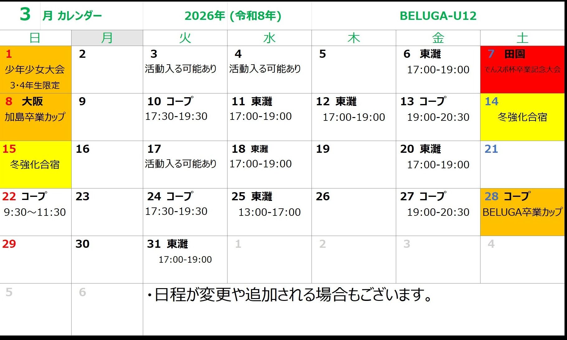大変お待たせいたしました。 クラブチームの3月の練習日程が確定致しました。